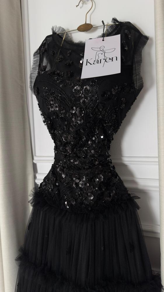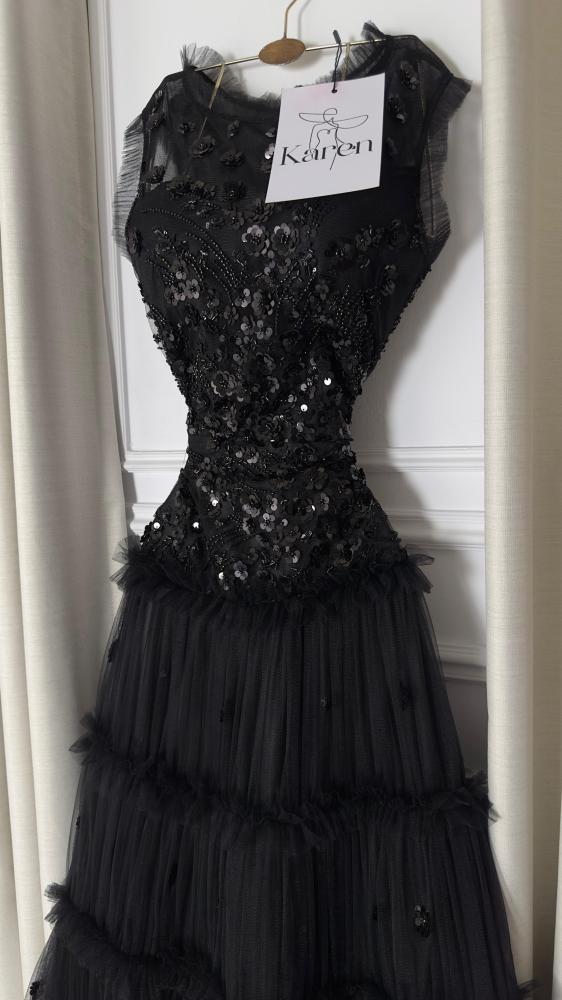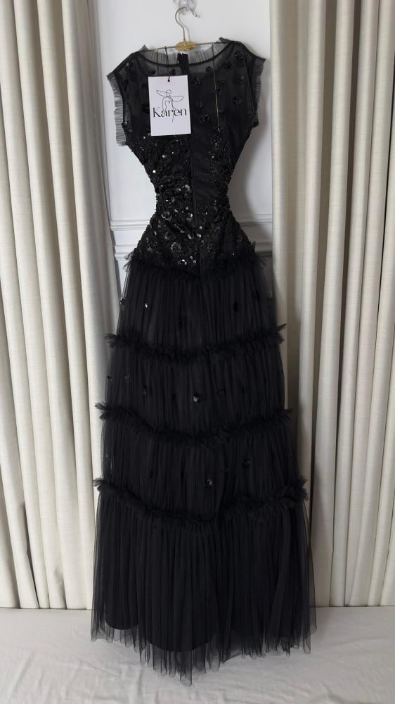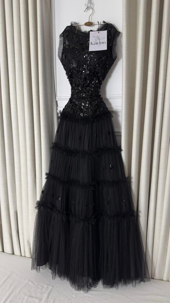 فستان سهره فاخر باللون الاسود مصمم بأسلوب انيق يدمج بين الكلاسيكية والعصريه مصنوع من التل الناعم ، على كلفه سهره يتميز بترتر فاخره تضفي لمسه ساحره من الفخامه مع قصه مريحه مثالي للمناسبات الخاصه والسهرات اجعليه خيارك الاول للتميز!