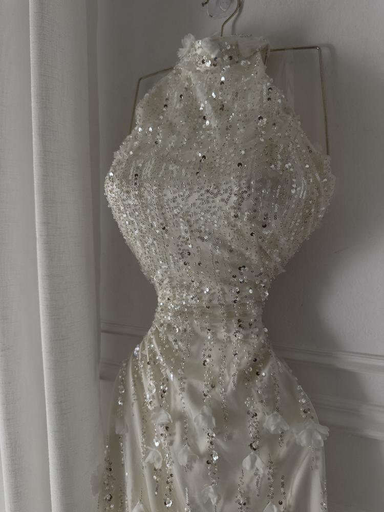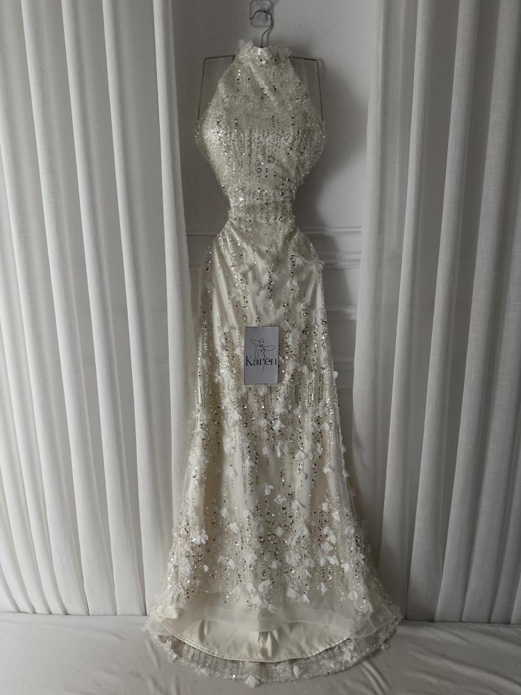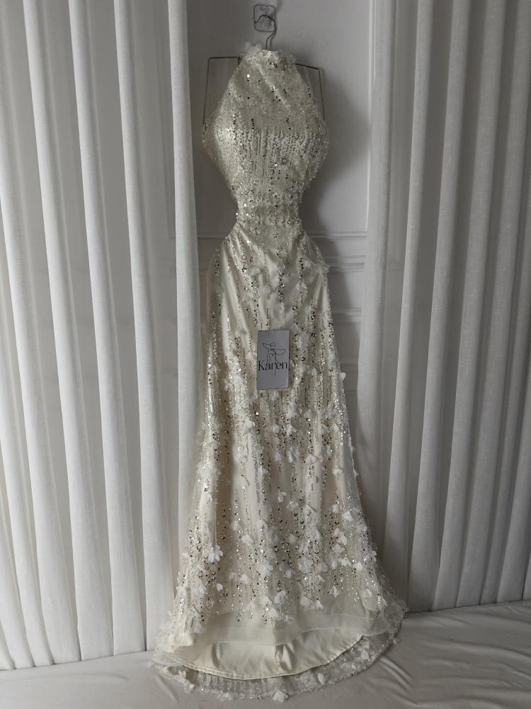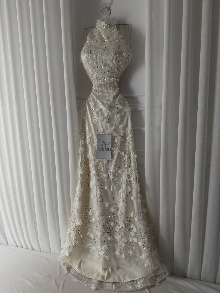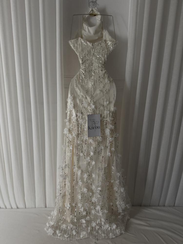 فستان ابيض ملكي بتصميم أنثوي ساحر، مزين بكلفه ترتر. أضافه إلى ورود ليزر من الاسفل ليمنحك جاذبيه لامثيل لها ✨