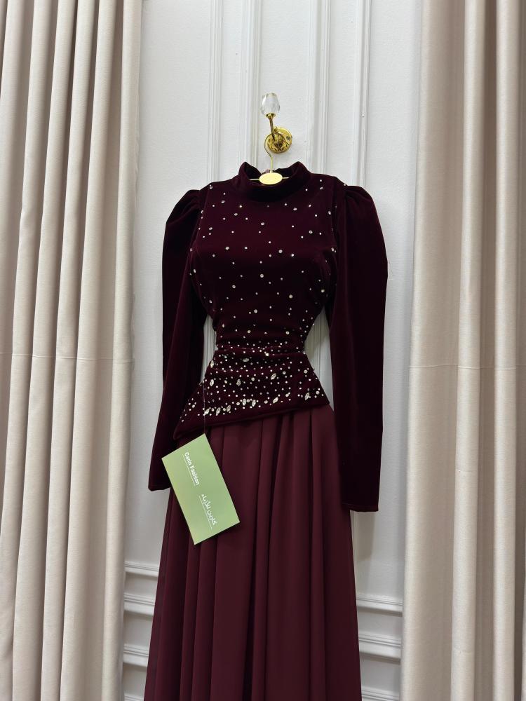 يأتي بتصميم ملكي من المخمل الفاخر بلون العنابي العميق الذي يمنح حضورآ دافئآ وفخمآ يتميز بقصه ضيقه تبرز الخصر. مع اكمام منسدله تضيف لمسة انثويه راقيه ، تزينه تطريزات لامعه من الصدر لتمنحه لمسه من الفخامه والترف، مثاليه للسهرات والمناسبات الراقيه