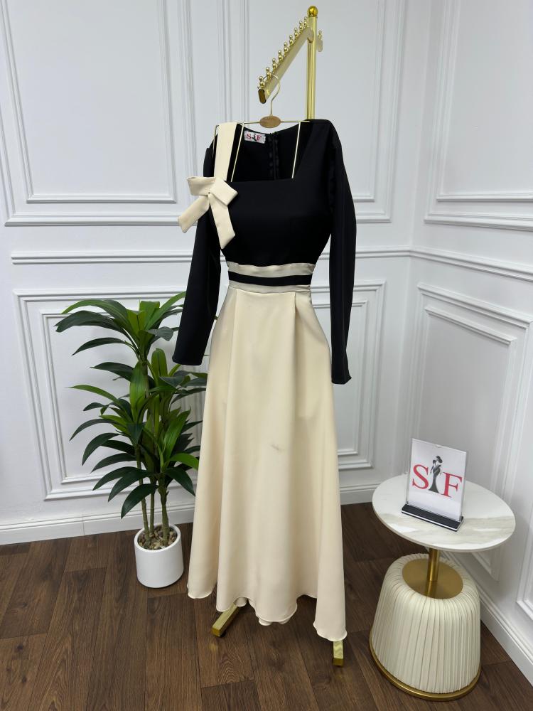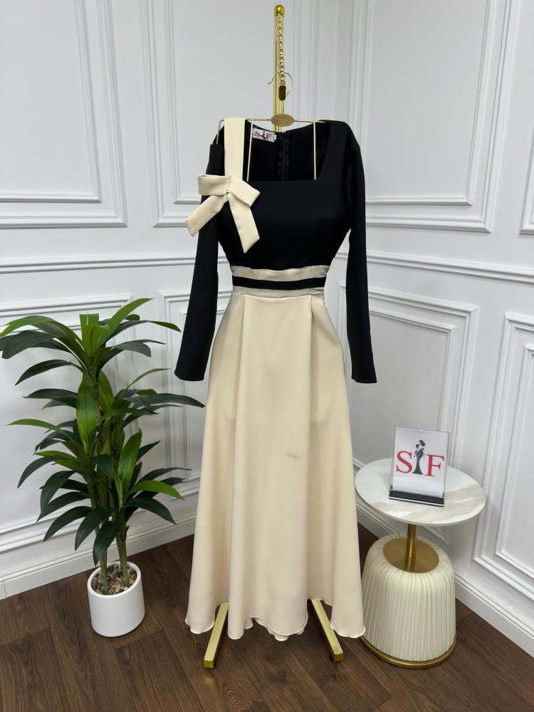 فستان قصير مميز مصنوع من الباربي يجمع بين اللونين الأسود والبيج بلمسه عصريه مستوحى من الطابع الفيكتوري لإطلالة فريدة وأنيقة.