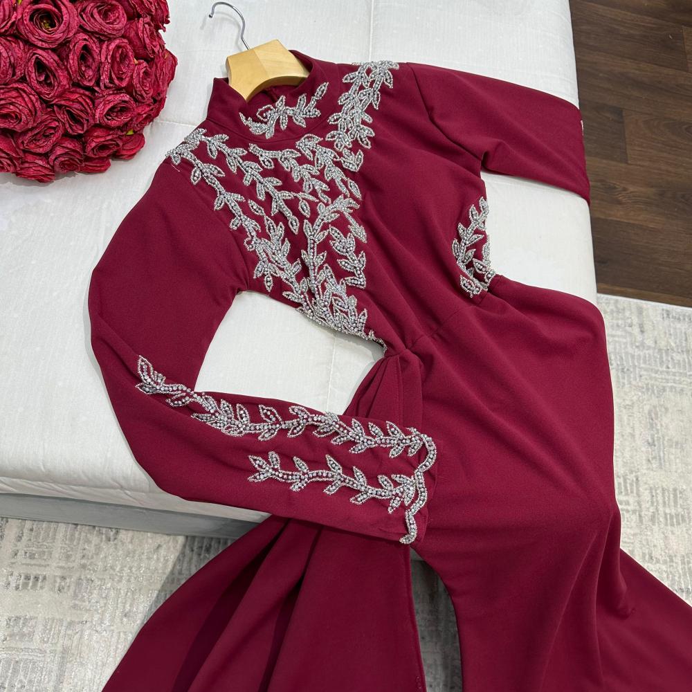 تألقي بإطلالة فريدة مع هذا الفستان الفاخر الذي يتميز بتطريزات دقيقة تضفي لمسة من الفخامة، الجزء العلوي مزين بتفاصيل رائعة، مع أكمام طويلة تضيف لمسة من الرقي.