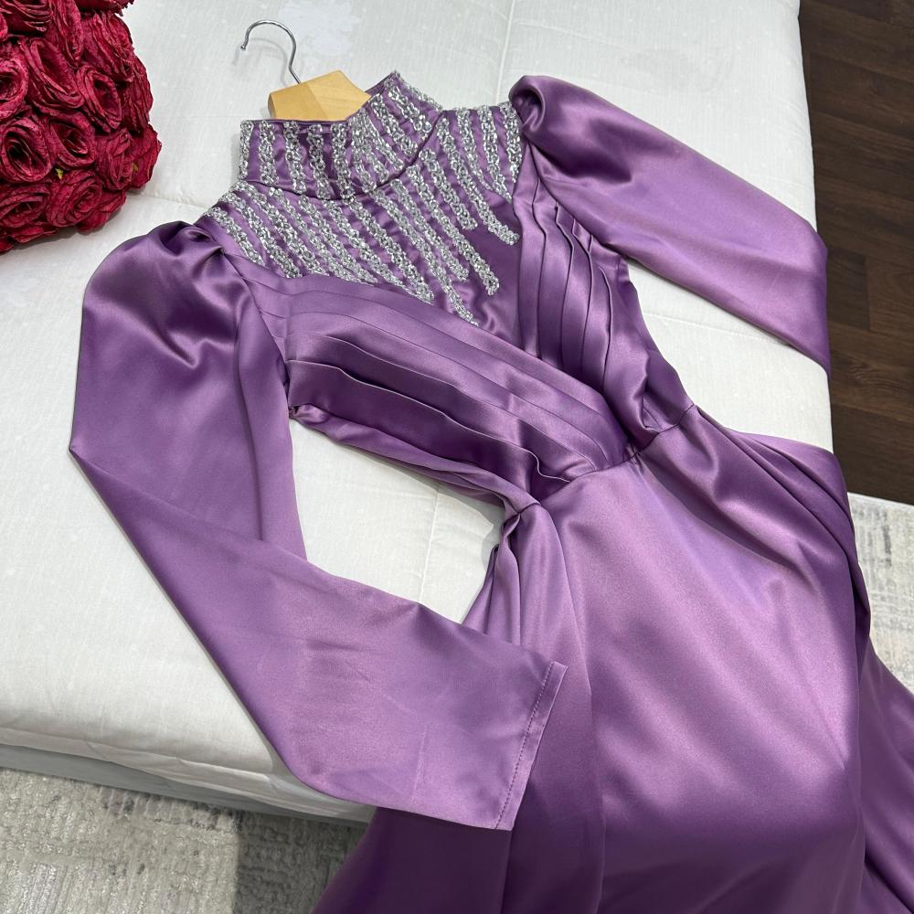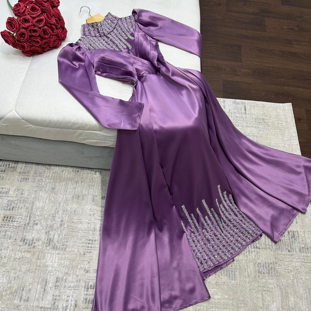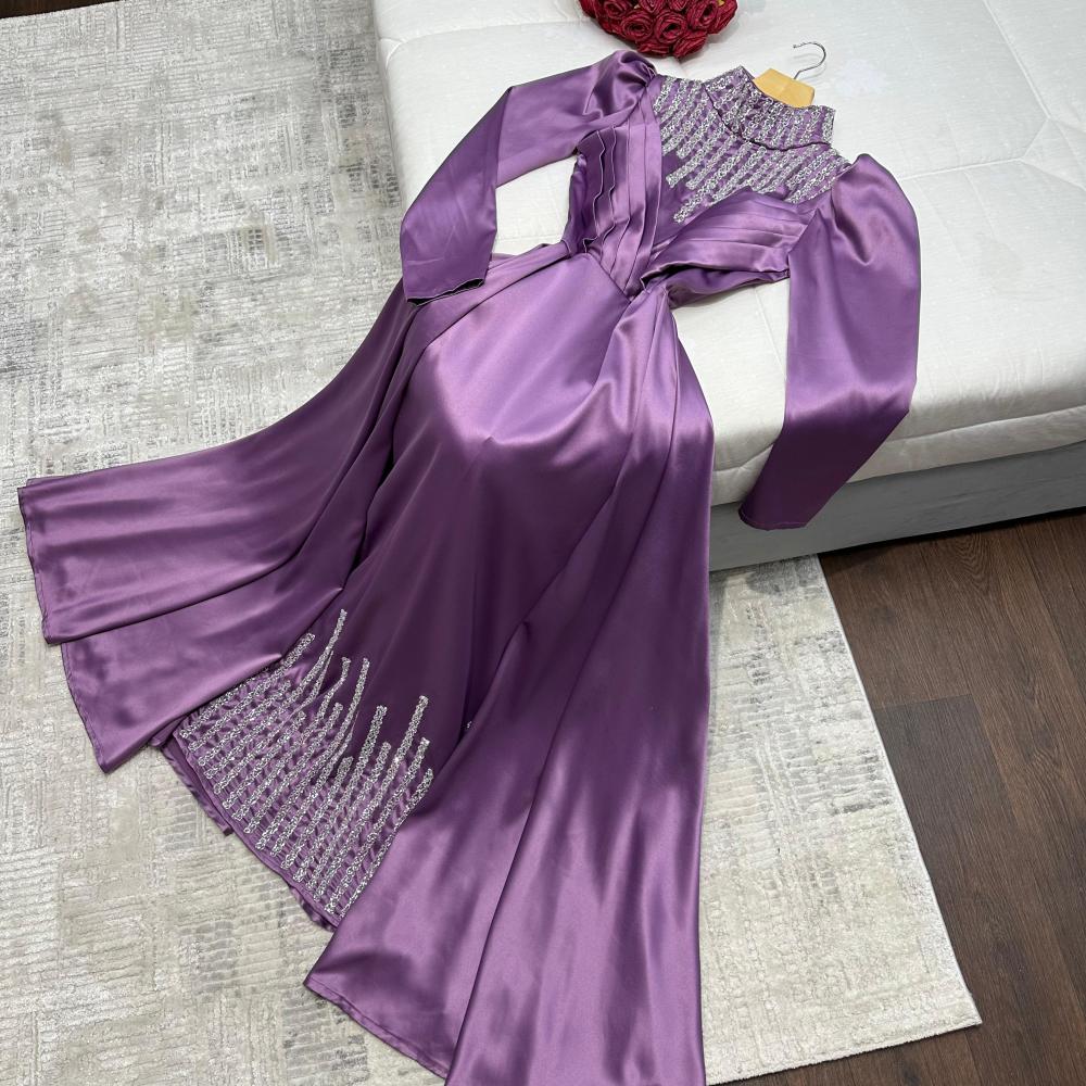 فستان سهرة بنفسجي بتصميم فريد وأنيق، يتميز بأكمام طويلة وياقة مرتفعة، مزين بتطريزات لامعة تعكس الفخامة والجاذبية. يكتمل الإطلالة بذيل خلفي واسع ينساب بأناقة، ليضفي لمسة من الرقي والتميز.