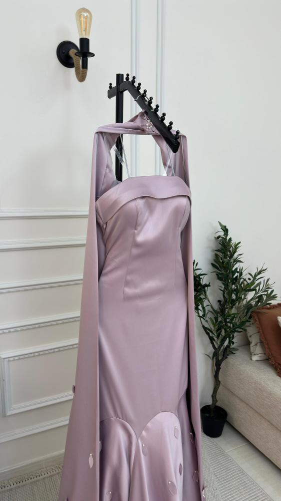 فستان سهرة بتصميم أنيق يتميز بقصة صدر مبتكرة بدون حمالات مع طية قماش أنيقة تضيف لمسة راقية. ينساب الفستان بقصة ضيقة عند الخصر قبل أن يتوسع إلى تنورة واسعة بتفاصيل متناغمة، مزينة بلمسات صغيرة على شكل أوراق ، مع وشاح ينسد على الرقبة مما يمنحه طابعًا مميزًا.