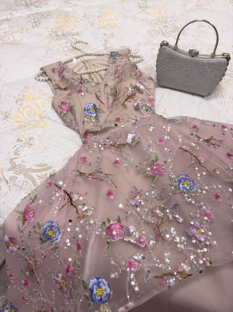 فستان أنثوي راقٍ بلون وردي فاتح القماش الشفاف المطرز بالورود الملونة مع تطريزات براقة يمنح لمسة ملكية. التصميم بدون أكمام ، بينما التنورة بطبقات خفيفة تضيف حركة جذابة. مثالي للمناسبات الفاخرة وحفلات الزفاف، يجمع بين الأناقة والرومانسية بأسلوب استثنائي.
