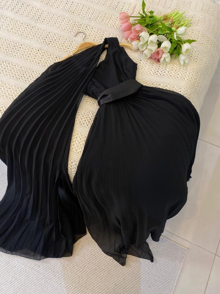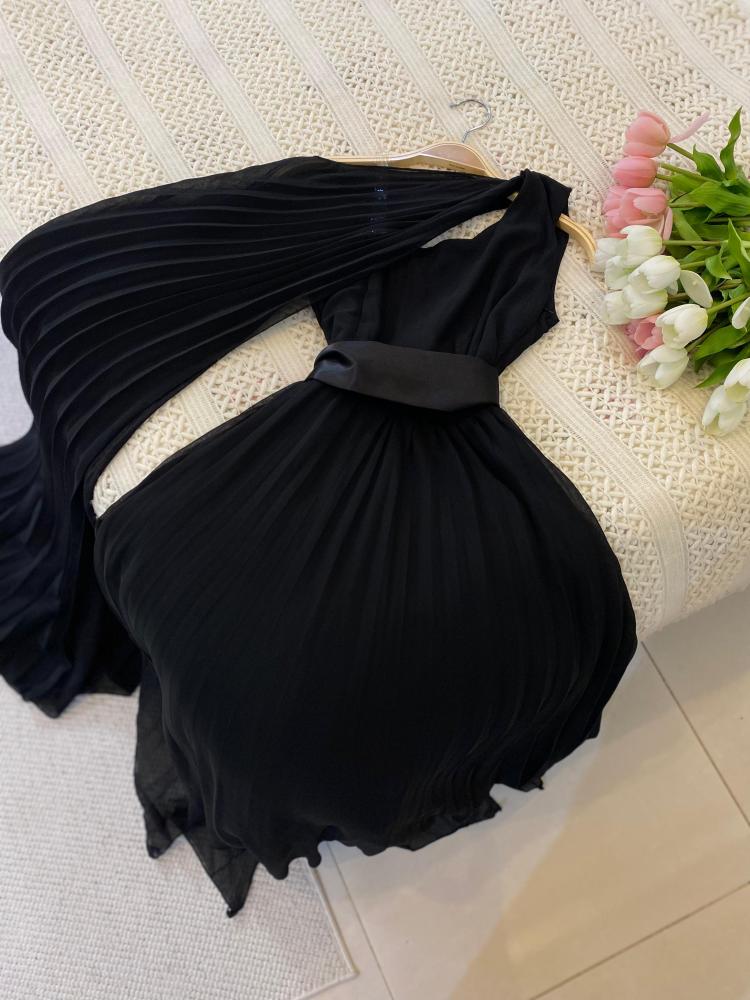 تألقي بأناقة لا مثيل لها مع هذا الفستان الأسود الفاخر! يتميز بقصة كلوش انسيابية مع كسرات ناعمة تضيف لمسة أنثوية ساحرة. تصميمه بكتف واحد مع كم طويل واسع يعزز من فخامته ويمنحك حضورًا راقيًا في أي مناسبة.