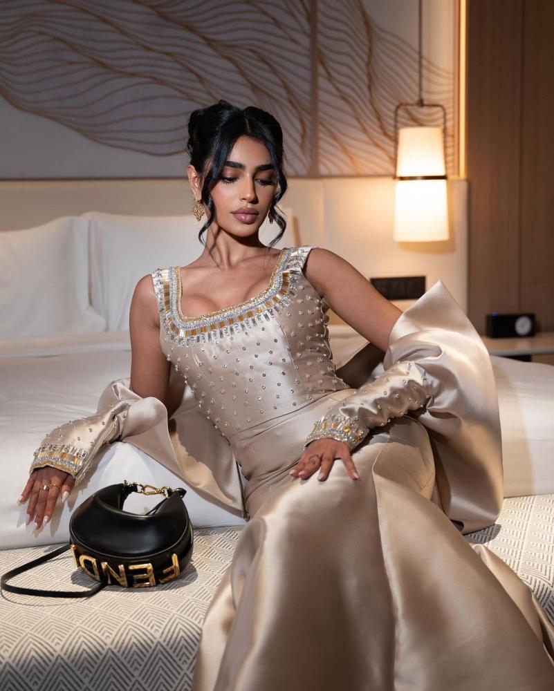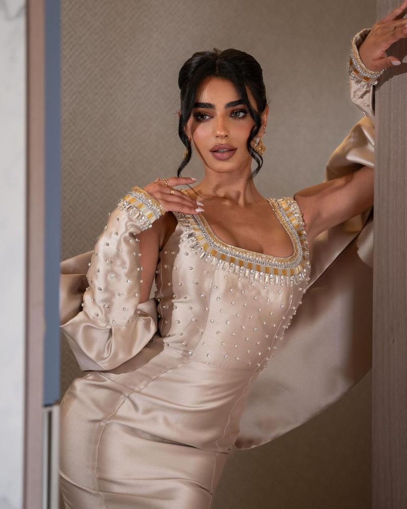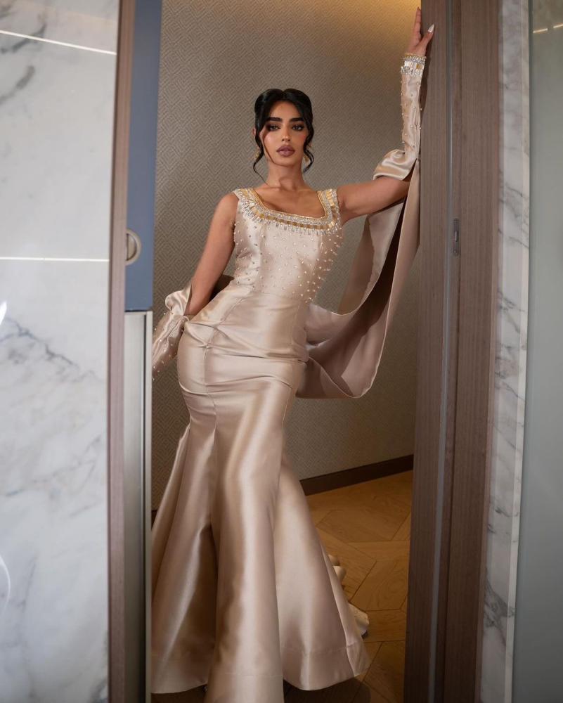 تألقي كالأميرات مع هذا الفستان الراقي بلونه الذهبي الذي يعكس الفخامة والأناقة! يتميز بتصميم ملكي مزين بتطريزات دقيقة عند الصدر والأكمام، مع أكمام منسدلة تمنحك إطلالة استثنائية تخطف الأنظار.