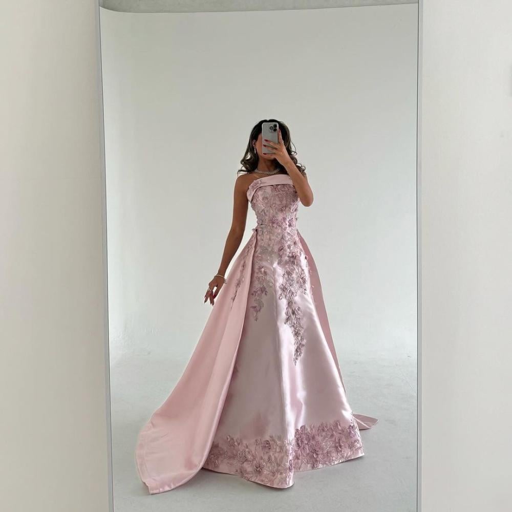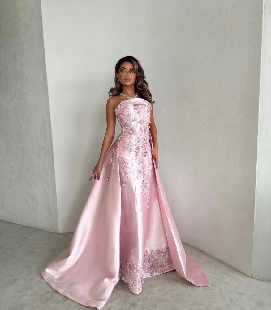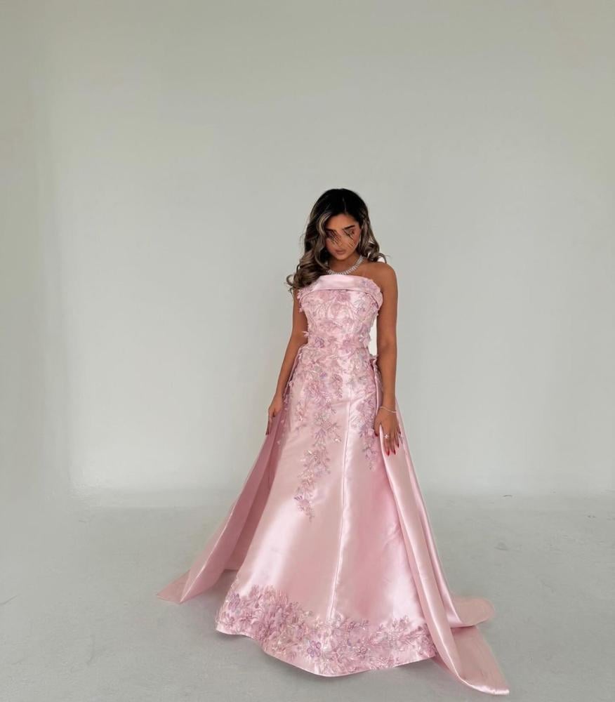 فستان وردي فاخر بتصميم ملكي يتميز بقصة كلاسيكية بدون أكمام تبرز جمال الكتفين والرقبة، مع تطريزات زهرية أنيقة ، تنسدل التنورة الطويلة بتصميم واسع يضفي جاذبية ساحرة .