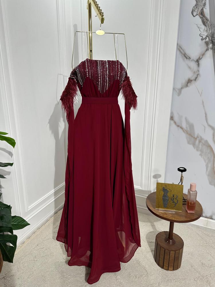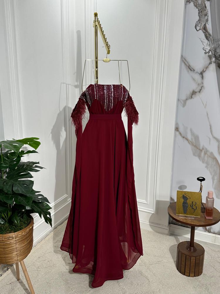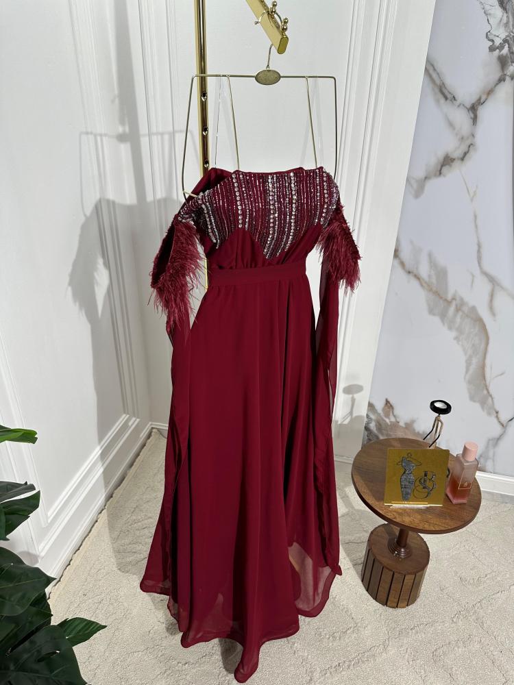 إذا كنتِ تبحثين عن إطلالة راقية وساحرة، فإن هذا الفستان باللون العنابي هو الخيار الأمثل لمناسباتكِ الفاخرة! يتميز بتصميم أوف شولدر أنثوي، مع تطريزات فاخرة على الصدر تضيف لمسة من البريق، وأكمام مزينة بالريش الفاخر لإطلالة فريدة تخطف الأنظار.