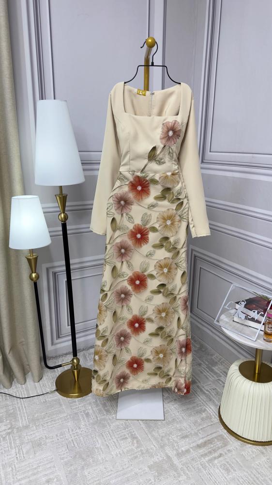 تميزي بإطلالة ناعمة وفاخرة مع هذا الفستان البيج المميز من خامة الباربي بتصميم أنيق مع تطريزات زهرية ملونة تضفي لمسة من الحيوية والجمال. قصّة الفستان مع الأكمام الطويلة تضفي مظهرًا كلاسيكيًا ومميزًا، مما يجعله الخيار المثالي للسهرات والمناسبات الراقية.