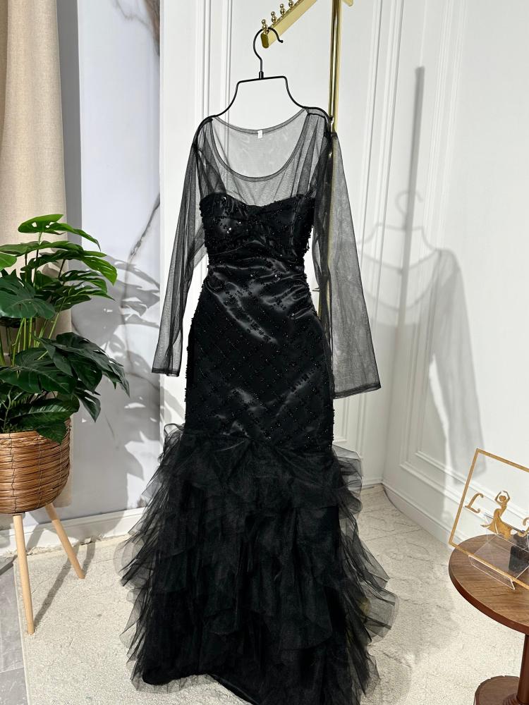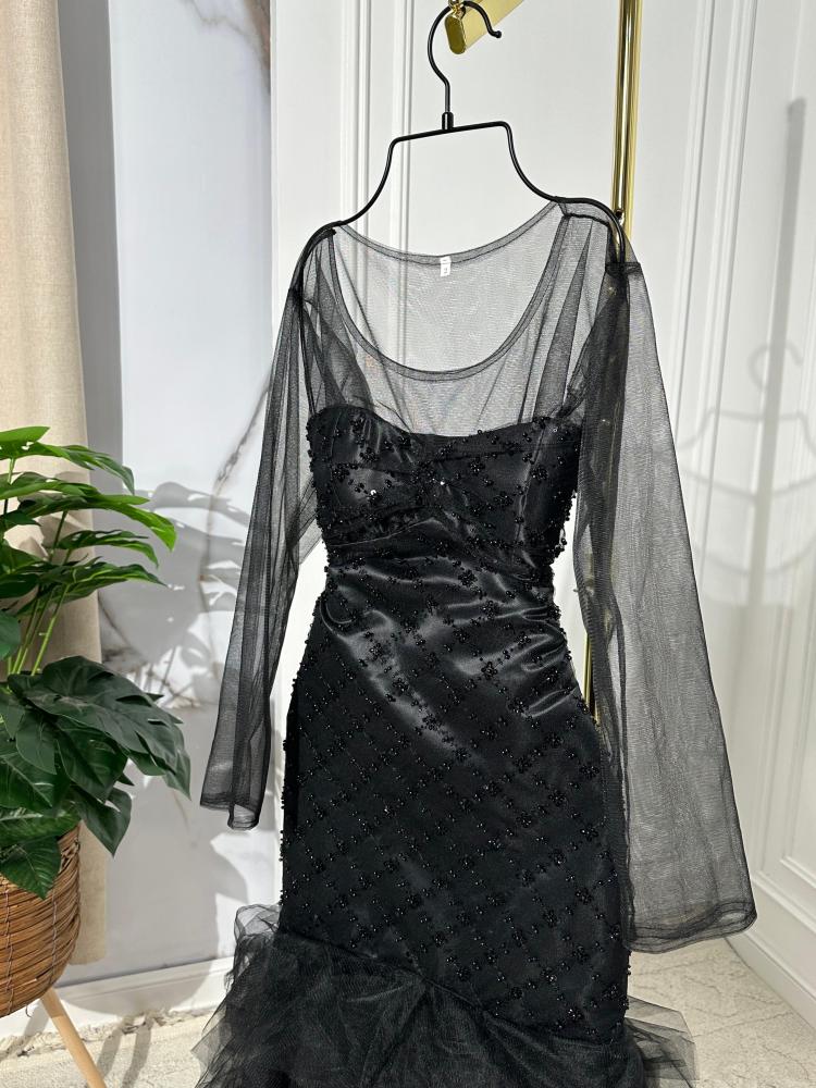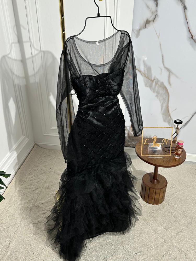 ارتقي بإطلالتك إلى مستوى جديد من الأناقة مع هذا الفستان الأسود المميز الصنوع من خامة التل مع الترتر ، القَصَّة الضيقة عند الخصر تعزز جمال القوام، بينما تنورة التل المتدرجة تضيف لمسة راقية مع الأكمام الشفافة الطويلة التي تمنحكِ مظهرًا أنثويًا أنيقًا، ليمنحكِ حضورًا مميزًا في كل مناسبة.