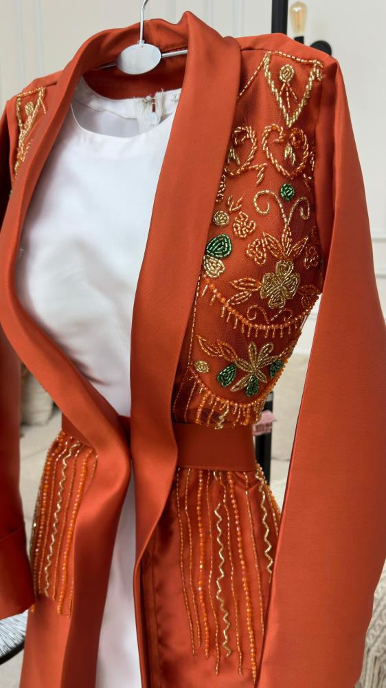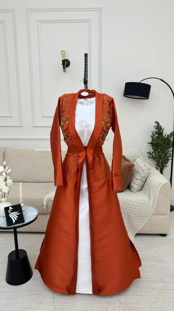 فستان سهرة مميز من خامة الميكادو الفاخرة، يتميز بتصميم فريد من نوعه يتكون من طبقتين ، الطبقة الأولى تأتي باللون الأبيض النقي، مع حزام على الخصر، أما الطبقة الثانية، فتتميز بتطريز يدوي فاخر ، مما يضفي على الفستان طابعًا من الفخامة والتفرد.