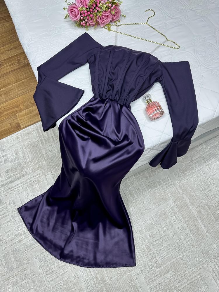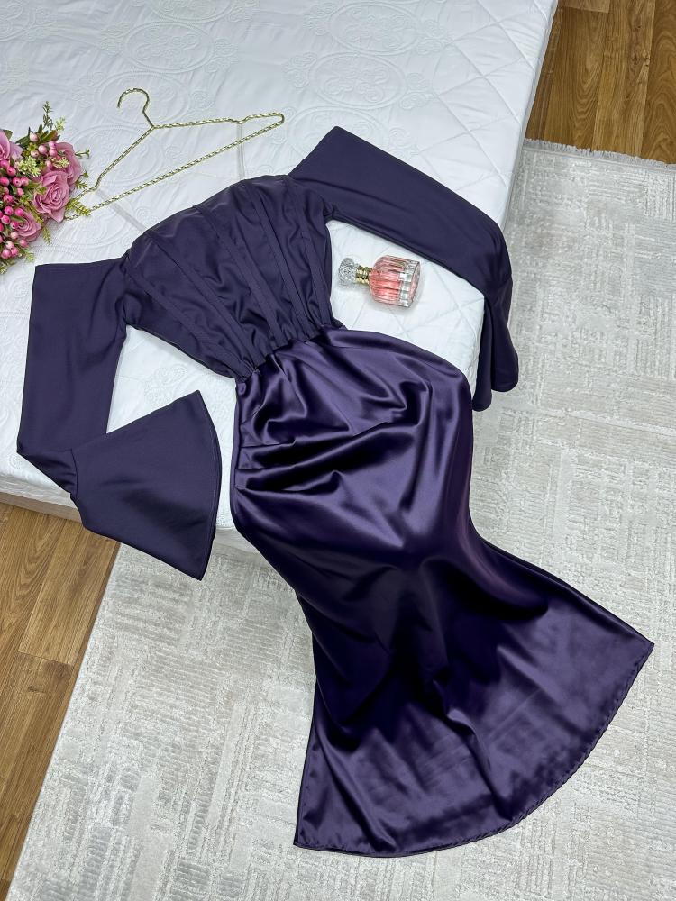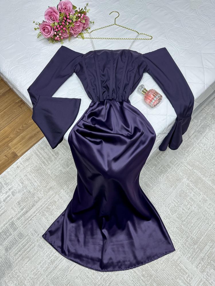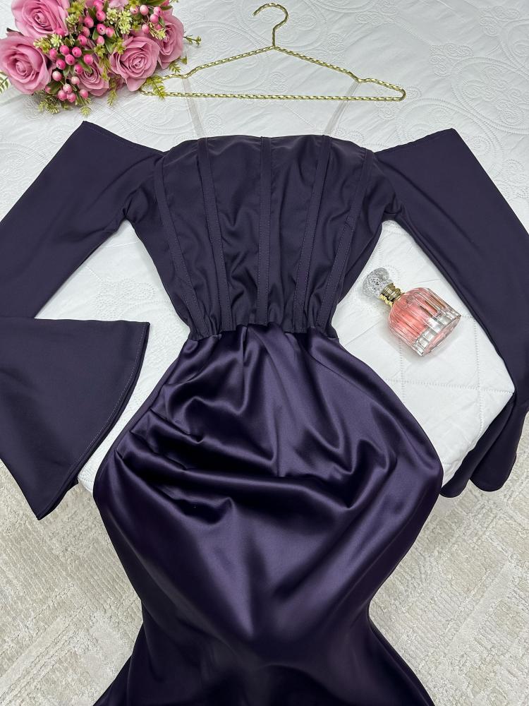 فستان سهرة راقٍ بتصميم أنيق ،مصنوع من خامة الاسترتش والتفته ليوفر تناسقًا مثاليًا مع القوام. يتميز بأكمام طويلة وواسعة تضفي لمسة من الرقي، بينما تأتي التنورة بتصميم كسرات خفيفة تمنحها حركة ناعمة وانسيابية جذابة. خيار مثالي لإطلالة ساحرة في المناسبات والسهرات الفاخرة.