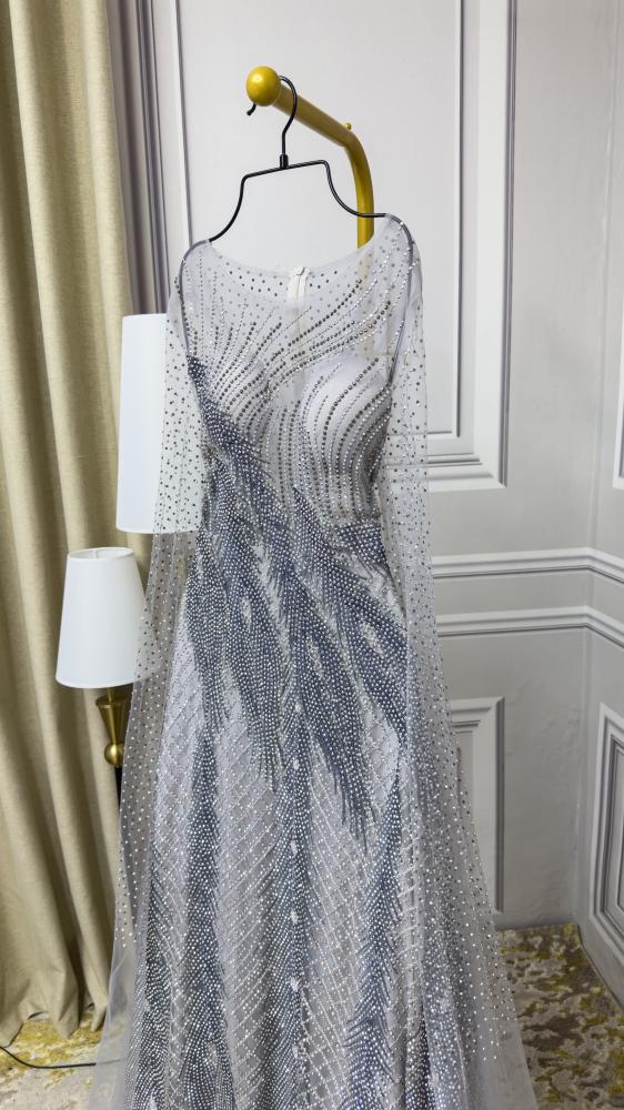 فستان سهرة فخم بتصميم ملكي . يتميز بلونه الفضي اللامع والمطرز بتفاصيل دقيقة من الخرز والكريستالات اللامعة التي تعكس الضوء بطريقة ساحرة. القماش الشفاف الذي يغطي الأكمام والصدر يضفي لمسة ناعمة وأنثوية، يمنحك حضورًا استثنائيًا بإطلالة فاخرة ومتميزة.