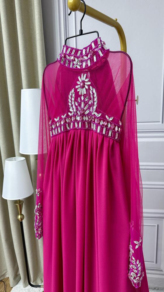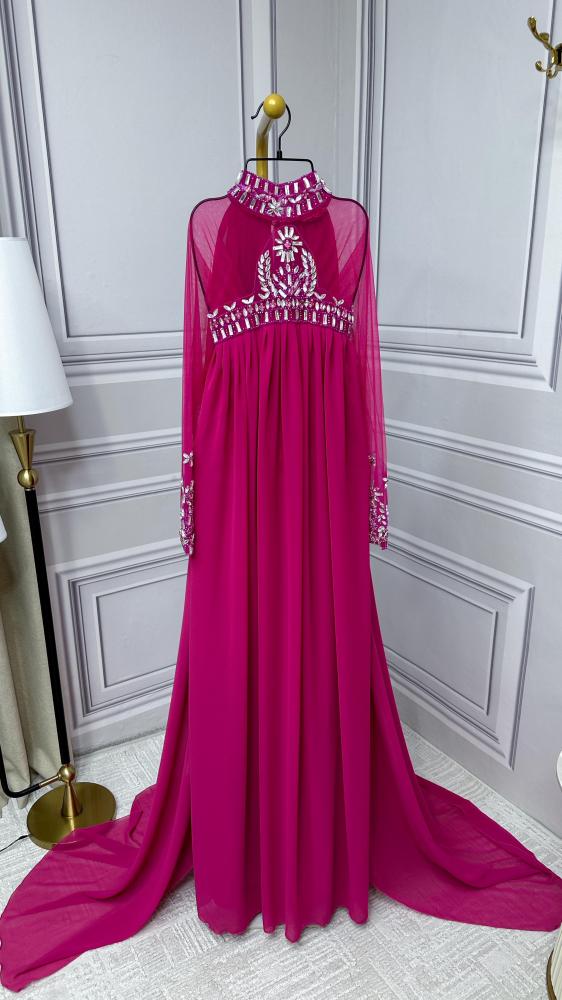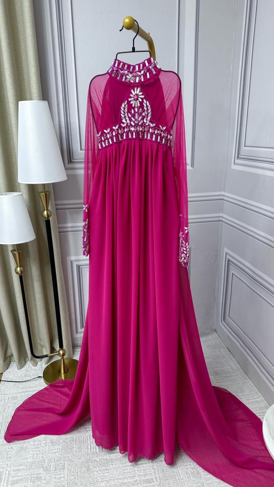 فستان ملكي فاخر باللون الفوشيا يمنحك إطلالة استثنائية تخطف الأنظار. يتميز بياقة عالية مزينة بتطريز يدوي راقي تضيف لمسة من الأناقة وأكمام شفافة مزينة بالتطريز الفاخر ، بينما يضيف الذيل الطويل لمسة ساحرة ليكون هذا الفستان الاختيار المثالي لكل امرأة تبحث عن التألق.