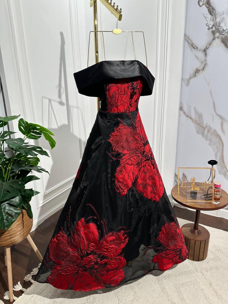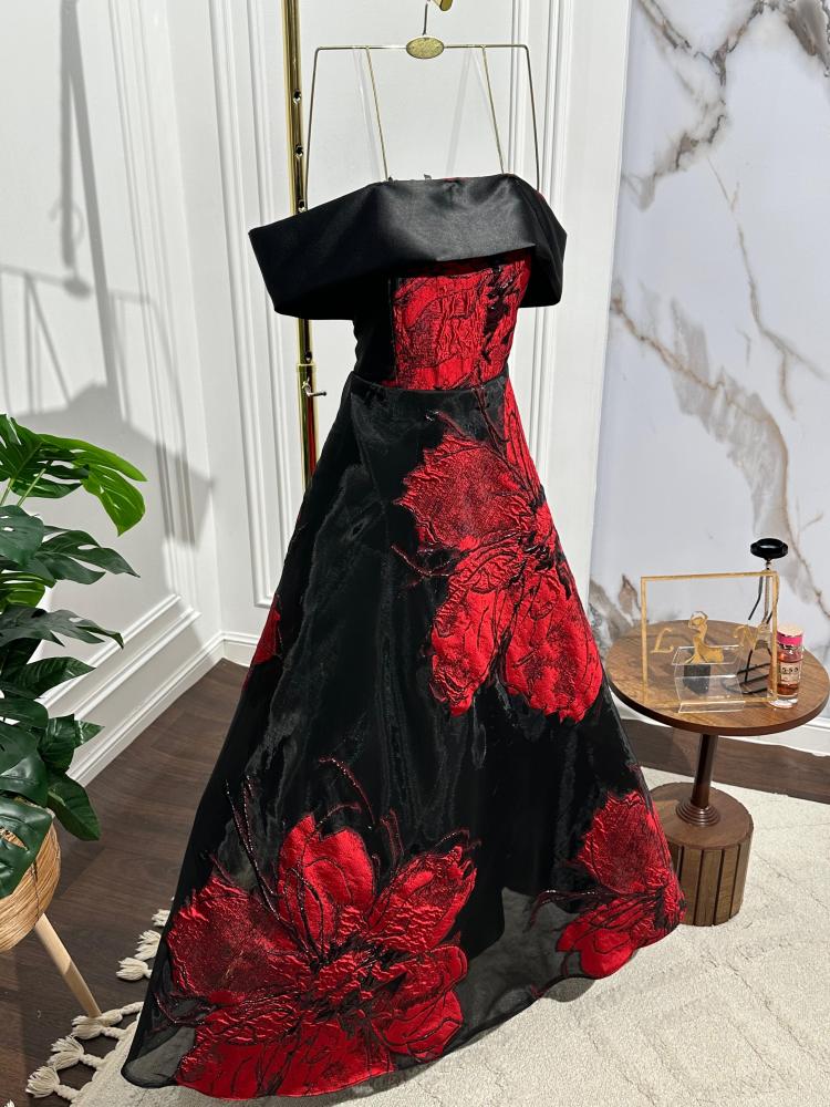 فستان بتصميم راقٍ من خامة الاورجنزا يجمع بين الأسود الكلاسيكي وسحر الورود الحمراء ، ليبرز جمالك بجاذبيته الاستثنائية وخاماته الفاخرة. مثالي للمناسبات الفخمة والسهرات المميزة.