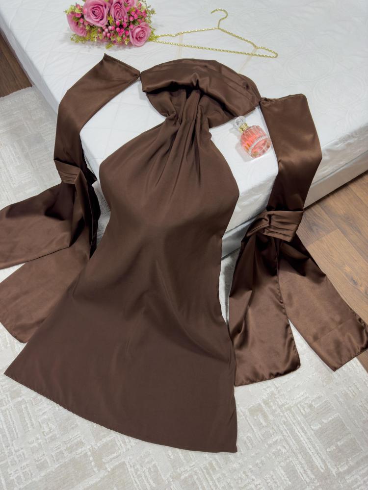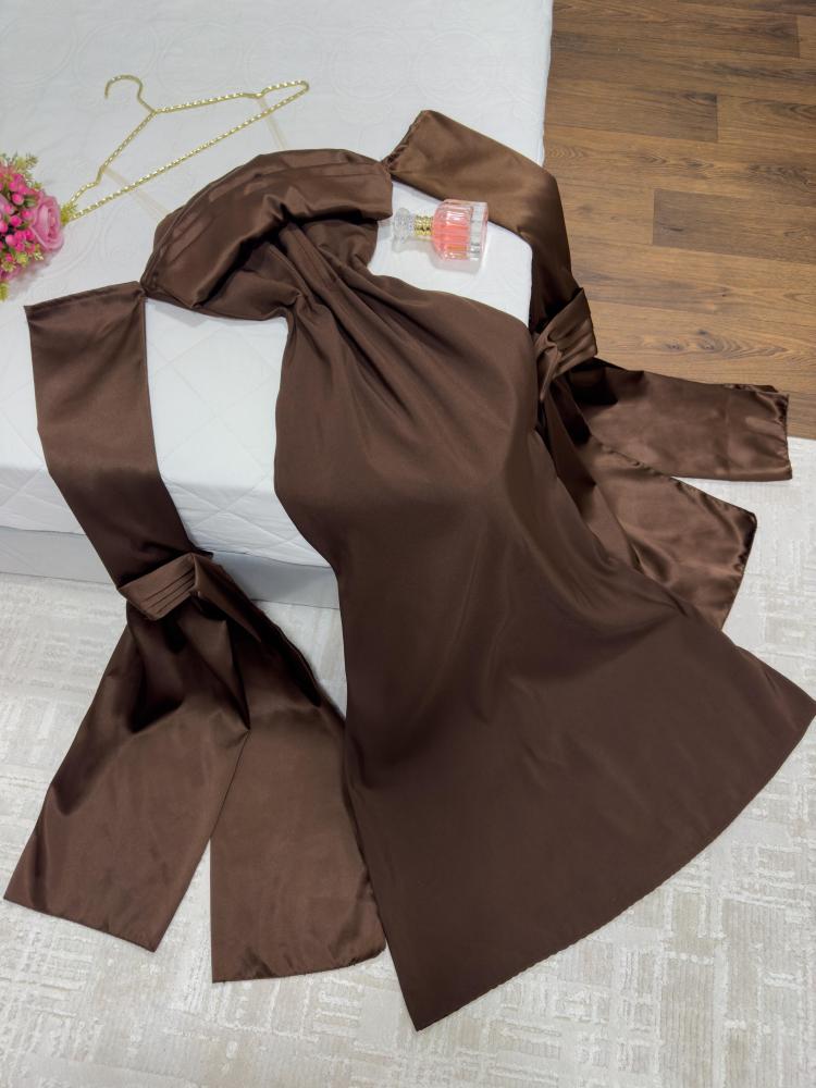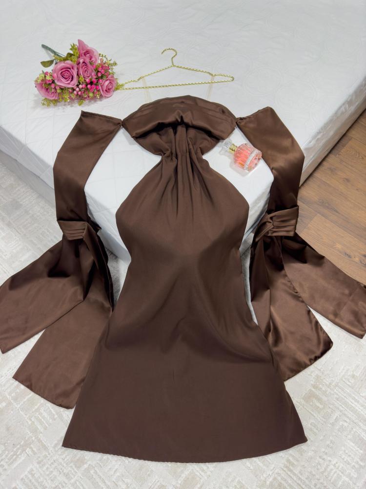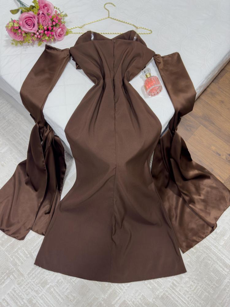 فستان أنيق بلون بني غني ومميز، مصنوع من خامة الباربي . يتميز الفستان بأكتاف مكشوفة واكمام طويلة تضفي لمسة عصرية وفخمة