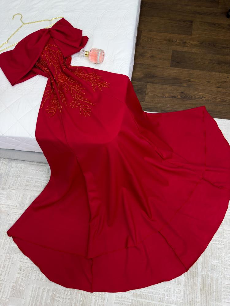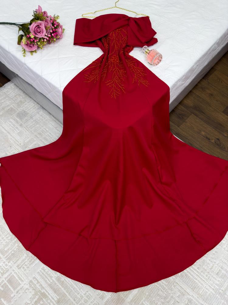 فستان أحمر ملكي جذاب، مصنوع من خامة الباربي الذي ينسدل بانسيابية ليمنح إطلالة أنثوية راقية. بتطريز يدوي أنيق على الصدر يعكس جمال التفاصيل .