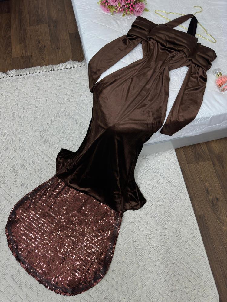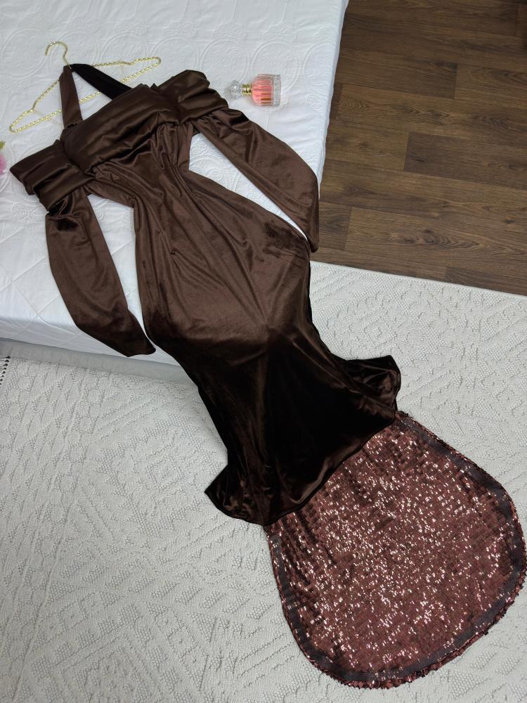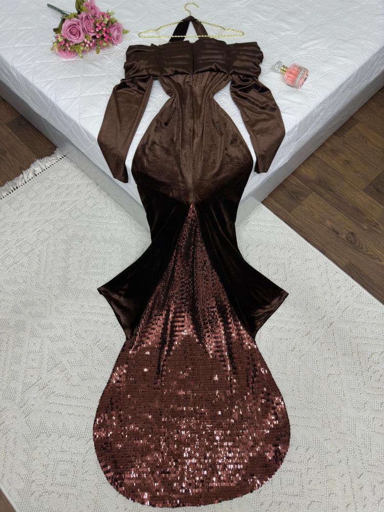 تميزي بهذا الفستان الراقي من المخمل التركي بلونه البني الرائع ، يتميز بقصة الكتف المكشوفة التي تضيف لمسة أنثوية، بينما يأتي الذيل المطرز بالترتر اللامع ليضفي إطلالة ملكية تخطف الأنظار في أي مناسبة.