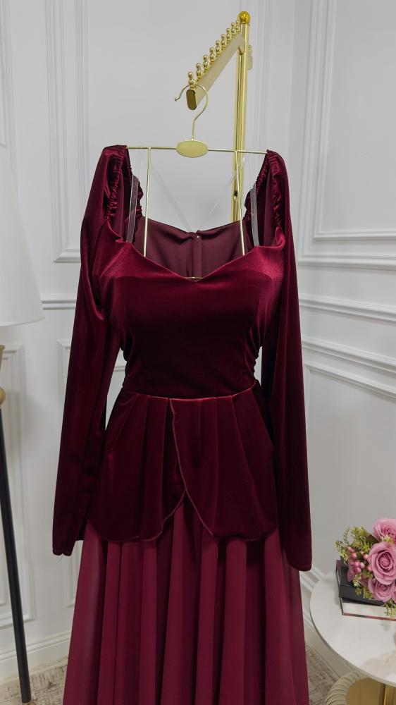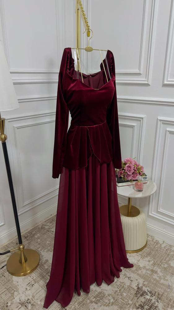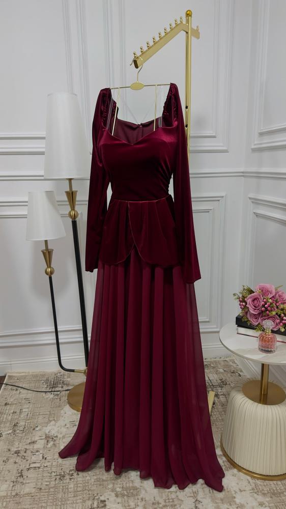 فستان سهرة راقٍ بلون عنابي فاخر، مصنوع من قماش المخمل الفاخر للجزء العلوي الذي يضفي لمسة من الدفء والفخامة. تنسدل التنورة من قماش الشيفون الانسيابي لتمنحك إطلالة ناعمة