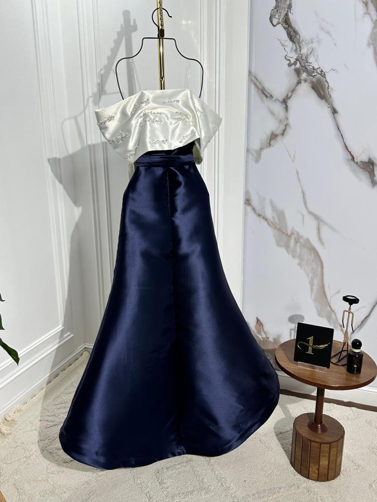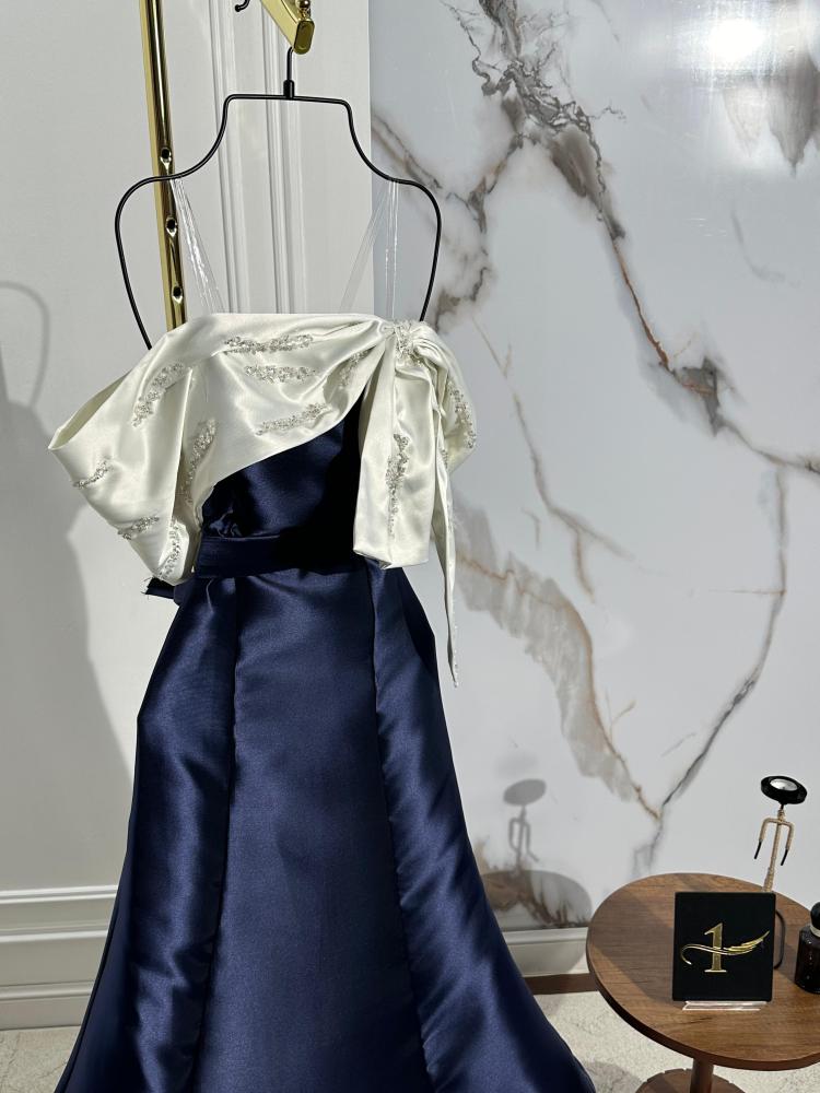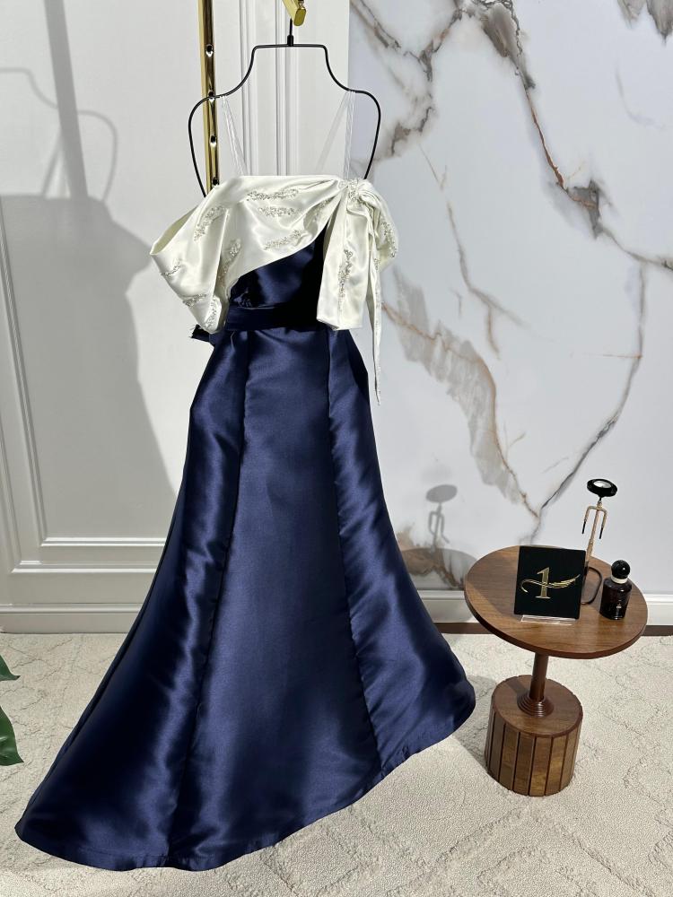فستان أنيق بلون كحلي داكن، بتصميم انسيابي واسع من الأسفل يعطي حركة أنيقة. الجزء العلوي يتميز بقماش أبيض منسدل على كتف واحد مع تطريز براق وعقدة جانبية تزيد من فخامة التصميم، مما يجعله مثاليًا للمناسبات الفاخرة. ✨