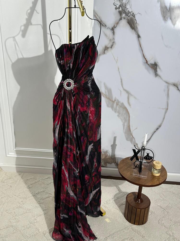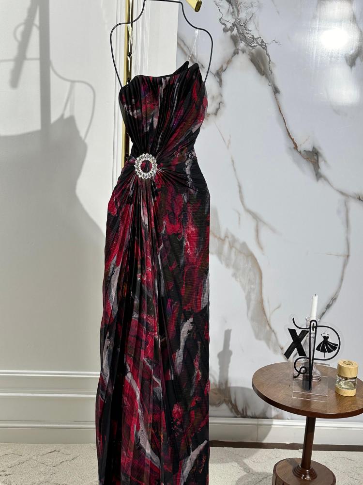 فستان سهرة جذاب وأنيق بقماش ناعم يجمع بين الألوان الداكنة والزخارف الزهرية، مع قصة كتف واحد مما يضفي لمسة من الجاذبية والأنوثة.