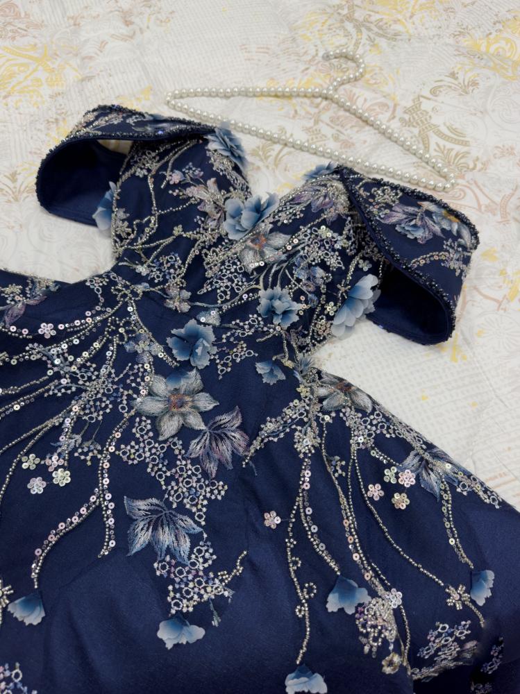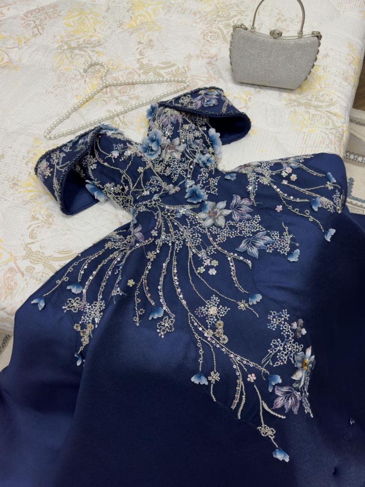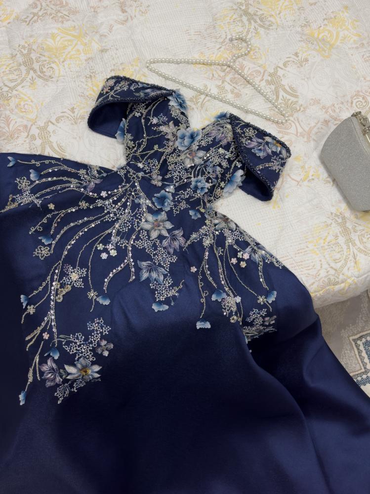 استعدي للتألق بإطلالة ملكية ساحرة مع هذا الفستان الفخم! بتصميم أنثوي أنيق مزين بتطريزات راقية وزهور براقة تضفي لمسة من الفخامة والرقي. القَصَّة الواسعة والأكمام الفريدة تمنحك حضورًا مميزًا في كل مناسبة.